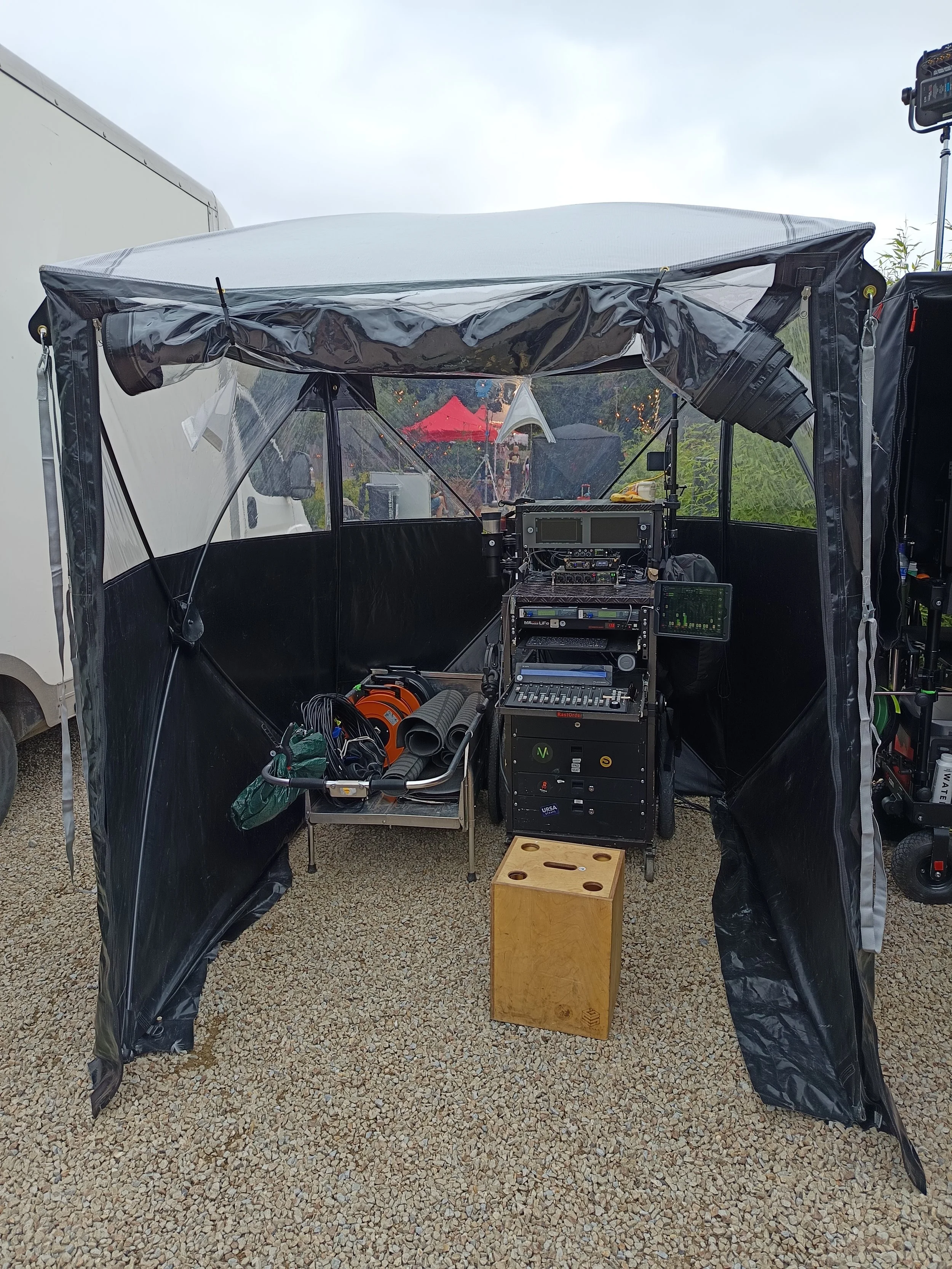Large Mercedes Sprinter sound truck - production work space with heating, AC power, inverter/solar and coffee machine! Ability to mix/record from here for small locations/bad weather. Off road tyres for Irish mud!